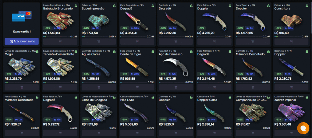 - Raridades: de Industrial até Covert, com facas e luvas classificados como itens “ouro”.